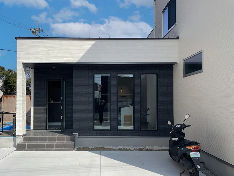 壁の色に合わせたライトを採用することで、建物全体に自然に馴染む仕上がりになっています。