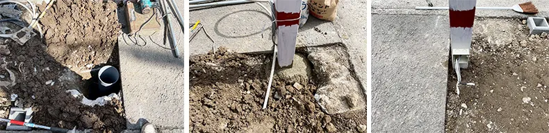 大型看板を安全にささえるため、地面を深く掘り下げて基礎を準備します。掘削した穴に支柱を据え付け、コンクリートを流し込み固めていきます。内照式のため、LED用の電源・配線を通して、完成です。