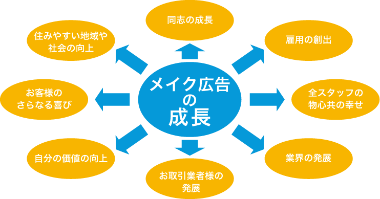 働くスタッフが結婚して幸せな家庭を築ける待遇、評価制度の確立、スタッフ全員が各部署でリーダーに、表彰制度の採用、定時に仕事を終える、それぞれが挑戦したい広告の分野を後押しする、県外・国外での事業展開、社内でのアクティビティ、そして皆が同じ方向を目指す会社。メイク広告はスタッフ一丸で、そんな会社になることを目指しています!